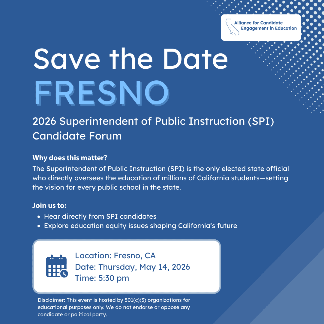 Join us in Fresno for a Candidate Engagement Forum featuring candidates for Superintendent of Public Instruction—the only elected official directly overseeing California’s TK-12 public schools. Hear their vision, ask questions, and learn about the education equity issues shaping the future of millions of students. May 14, 2026, from 5:30–7:30 pm.