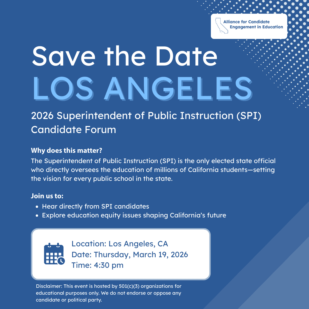 Join us in Los Angeles for a Candidate Engagement Forum featuring candidates for Superintendent of Public Instruction—the only elected official directly overseeing California’s TK-12 public schools. Hear their vision, ask questions, and learn about the education equity issues shaping the future of millions of students. March 19, 2026, from 4:30–7:00 pm.