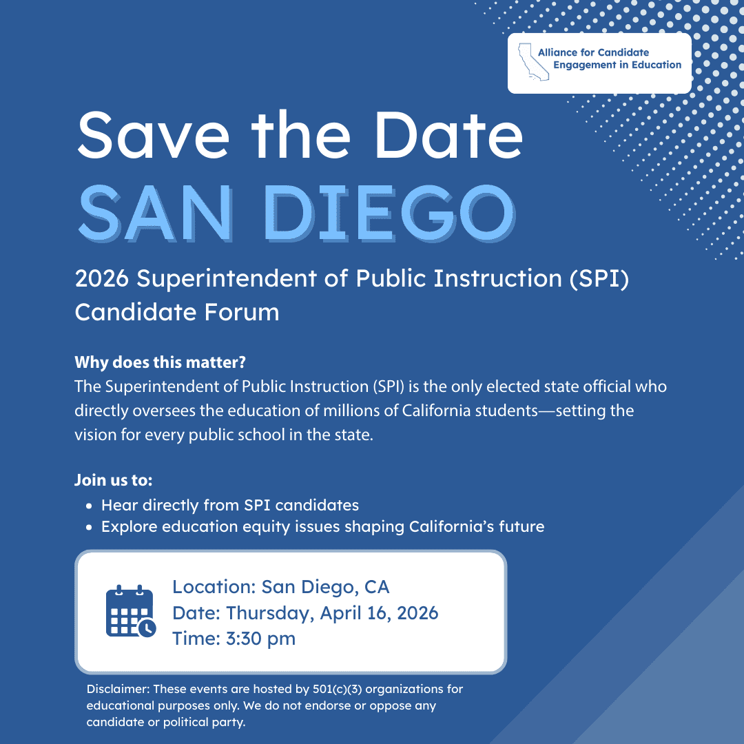 Join us in San Diego for a Candidate Engagement Forum featuring candidates for Superintendent of Public Instruction—the only elected official directly overseeing California’s TK-12 public schools. Hear their vision, ask questions, and learn about the education equity issues shaping the future of millions of students. April 16, 2026, from 3:30–6:00 pm.
